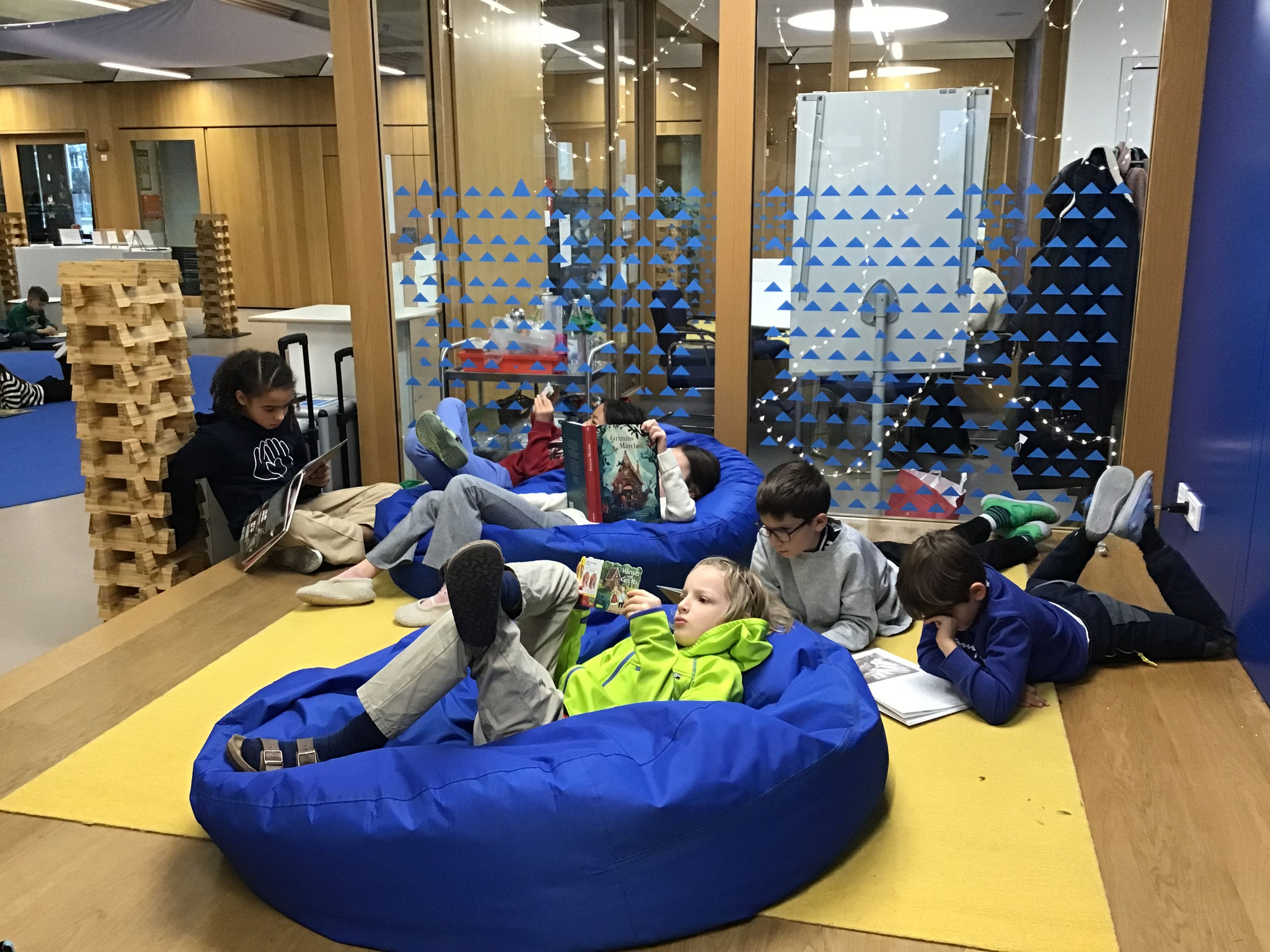 Der gemeinsame Marktplatz dient uns als Ort der Begegnung und des gemeinsamen Arbeitens. Bereits vor Unterrichtsbeginn können wir uns im Lernhaus aufhalten und dort mit anderen Kindern spielen, lesen oder üben.